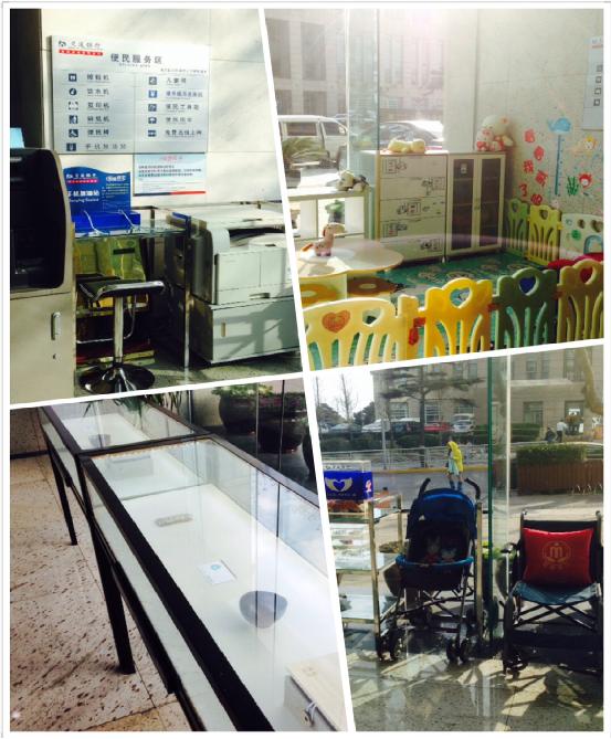 除业务办理相关设备外,交通银行青岛分行营业部秉承惠民便民的服务态度为进入营业厅的每一位客户提供便民服务,如硬纸币兑换机、饮水机、复印机、碎纸机、儿童娱乐区、手机加油站、便民椅等。大厅内专设产品展示柜,为客户展示交行最新的贵金属等产品