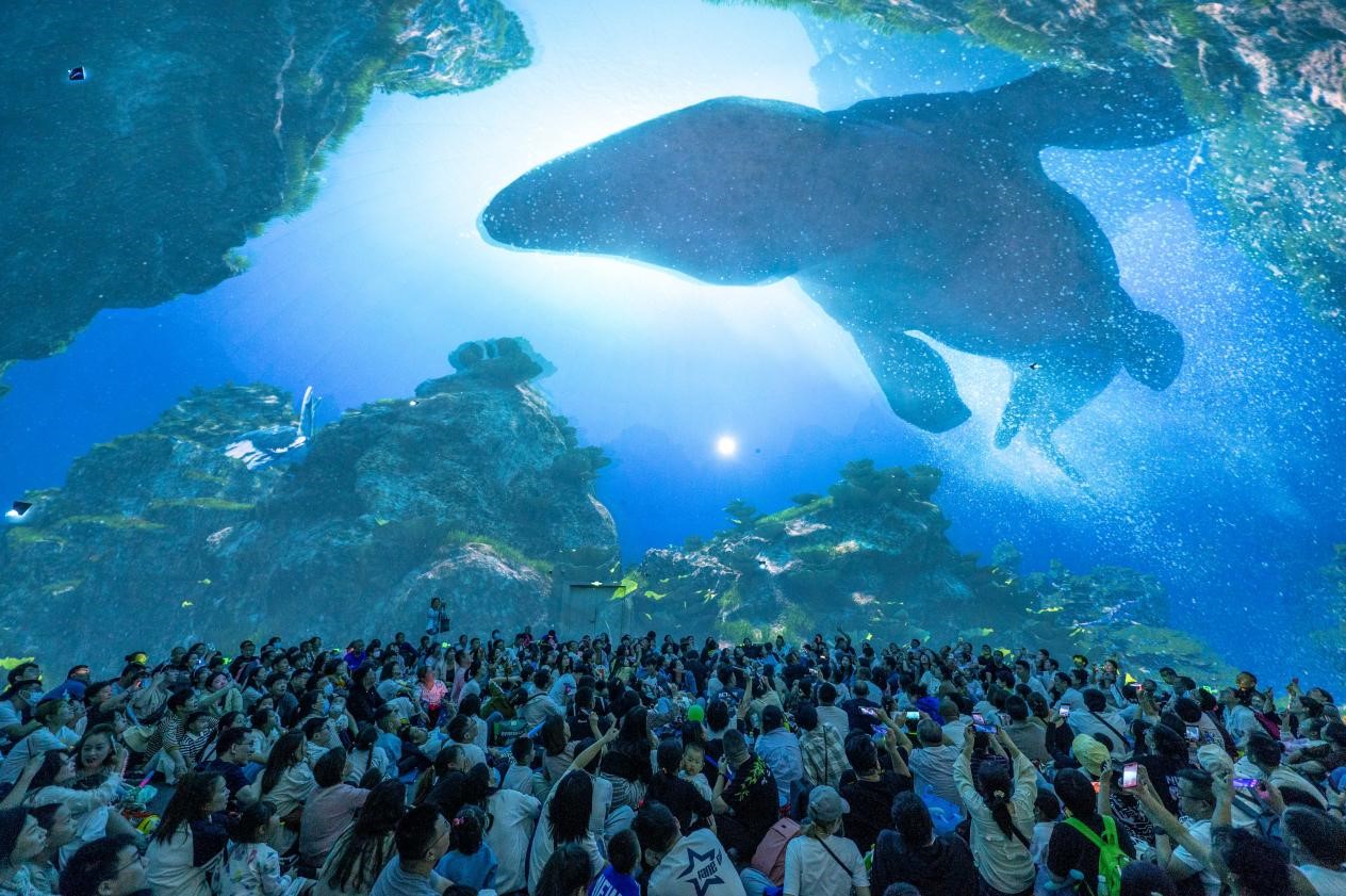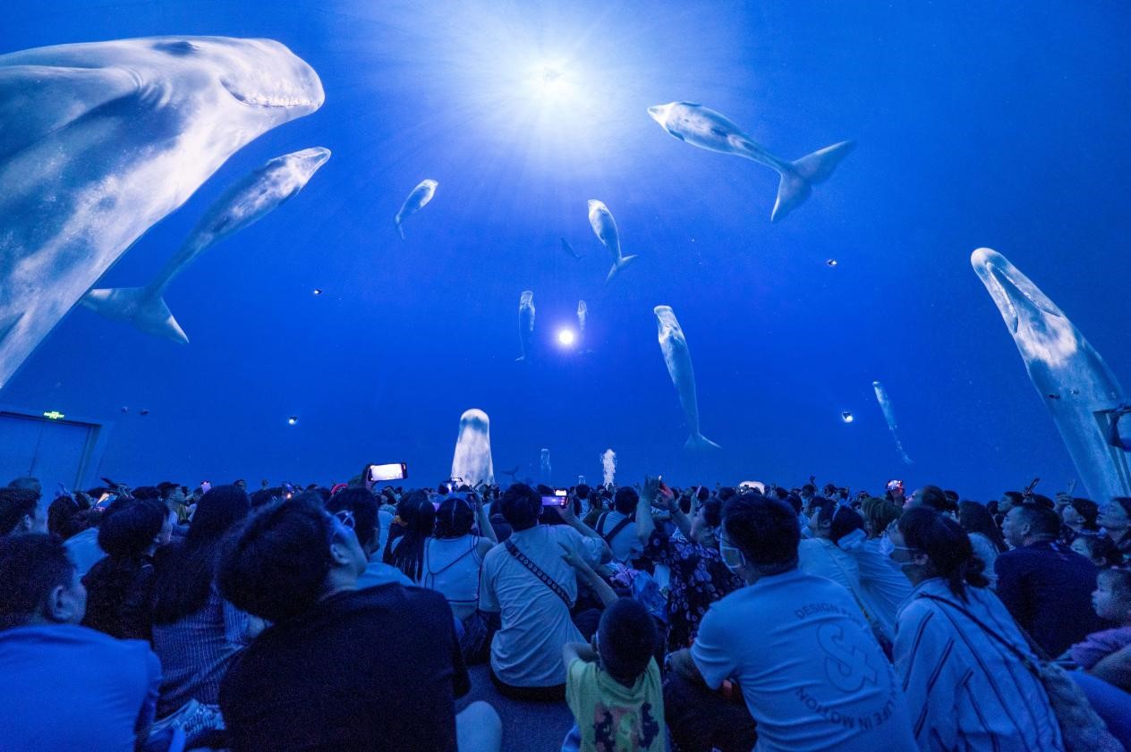 此前的影片是以海洋视角,通过不断下沉深海,邂逅蓝鲸、海豚、企鹅、水母等,沉浸式探索深海生物和遗迹。这次新影片则加入了穿越的故事情节,从寒武纪开始、一直穿越到奥陶纪、侏罗纪、白垩纪…“穿越”到不同时代的远古海洋,游历不同的海洋地貌。记者通过现场工作人员了解到,新片讲述的是在巨大的图书馆中,暗藏着一本神奇的“魔法之书”,随着时光漩涡进入生命大爆发的寒武纪时代,一场探秘远古海洋的魔幻之旅就此展开。巨大的幻彩章鱼、沉睡的抹香鲸、神秘的美人鱼还有深海里的古老城堡……近距离观摩遥不可及的深海生物和遗迹,这一刻,分不清梦境还是现实。全景的视听系统将100%还原海洋真实音效,呈现超强的听觉冲击力和真实感,现场游客不需佩戴VR眼镜,就可以拥有独一无二的沉浸式感官体验,而且随手拍就是大片,刷爆你的朋友圈。本次的影片上新,属定期更换,未来将让星空、宇宙等都近在咫尺,或以昆虫等视角,发现世界。