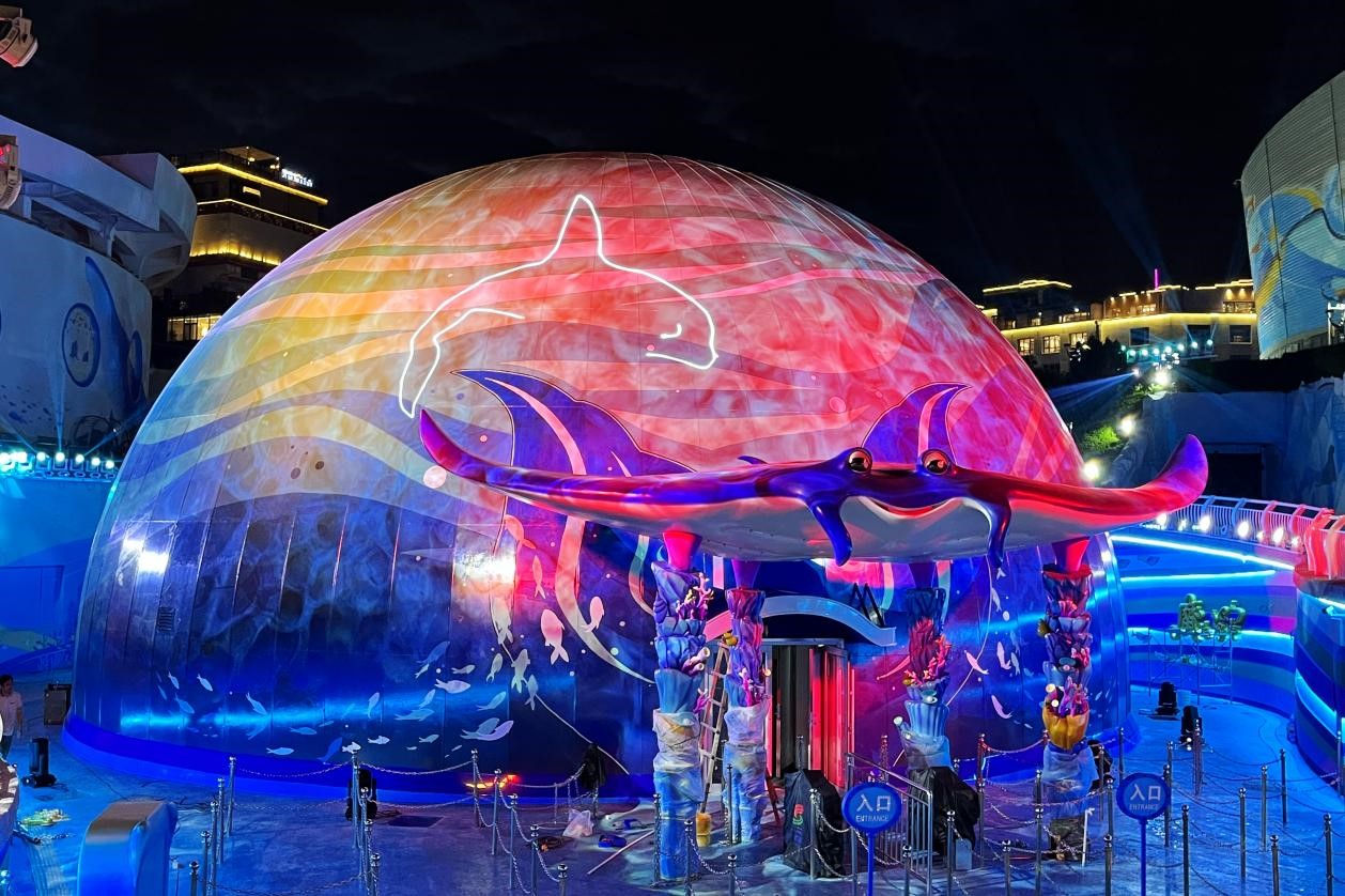据悉,影院总面积380平方米,其中观影屏幕直径22米,投影天幕面积达600平米,观影视域为360°全景,现场可容纳350人同时观影。影院组合裸眼3D、球形投射和虚拟现实技术,完美营造出立体、深邃、震撼的视听效果。此外,在夜晚,影院的球体建筑还会有免费的灯光秀,各种海洋动物与五彩缤纷的灯光将映射在球体建筑上,呈现另一番景象。球体灯光秀也将成为滨海一线新的网红打卡地。