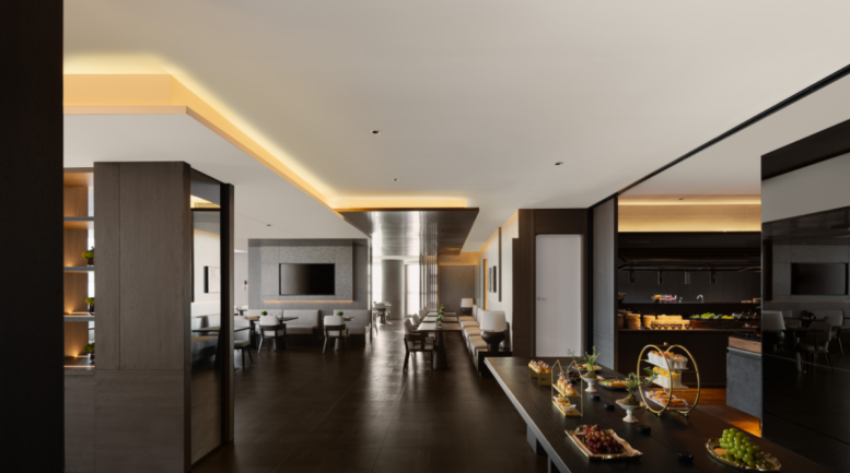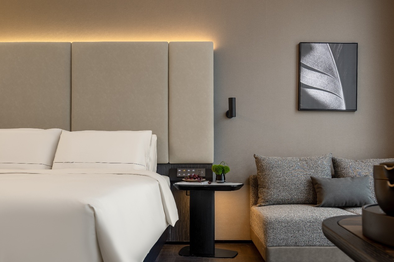 客房设计更是贴心精致,方形中岛整合盥洗台与迷你吧,兼具收纳与通透感,U 形步入式衣帽间颠覆传统,模块家具与多边形书桌灵活适配多元需求。自然光、流水音疗及自然材质的运用,传递人文温度,尽显松弛、静谧的高品质旅居体验。