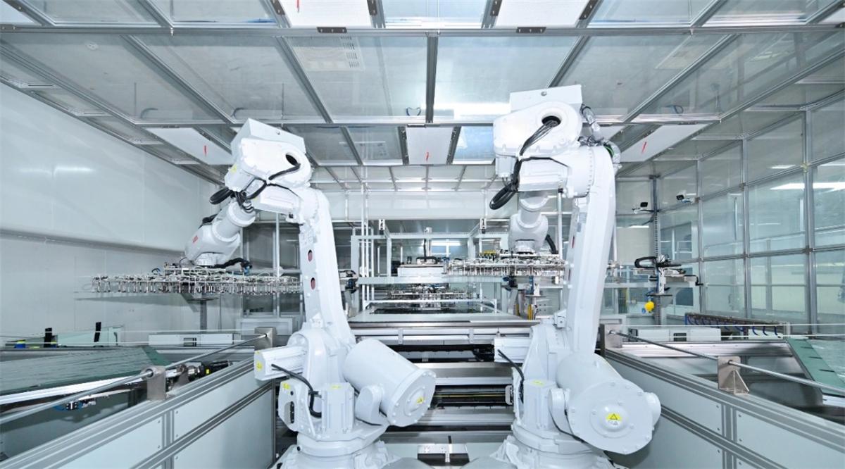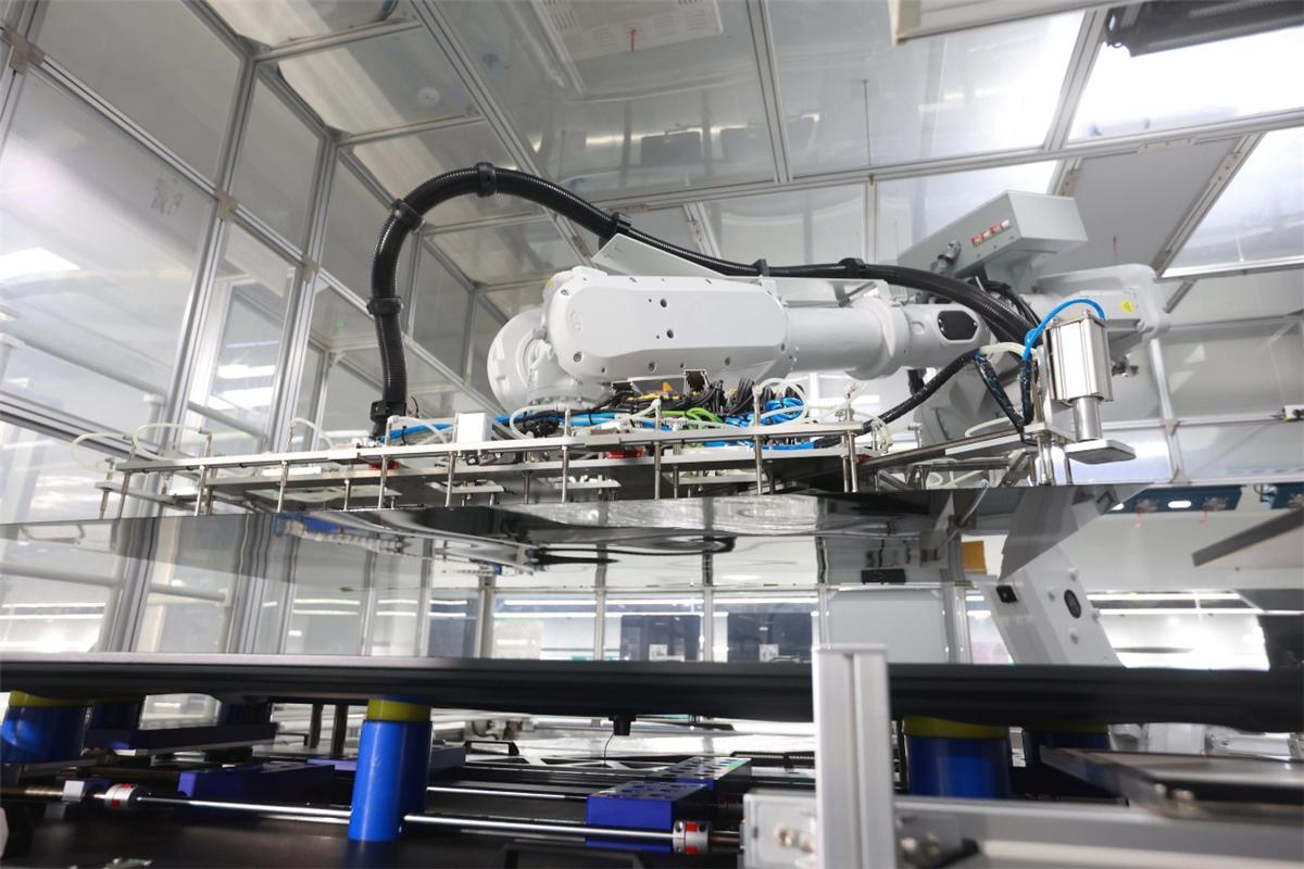 以通过机器人实现“面板自动精准卡合”这一行业首创技术为例,以往85吋大屏面板的精准装配需要5名工人手动对齐,不仅费力,还存在精度偏差和效率瓶颈。如今,这里搭载了行业首创的矩阵式面板精确卡合方案,通过多组高精度视觉相机为机器人赋能“眼睛”,搭配AI“大脑”实现自动撕膜、精准装配和实时校准的全流程自动化操作,它能实现0.1毫米级的精准定位,确保每次抓取和装配都毫厘不差。