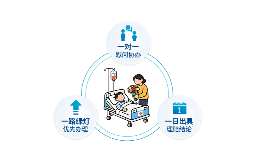 一日出具理赔结论:原则上在1个工作日内出具理赔结论,第一时间缓解客户资金压力,让客户安心康复、无忧生活。