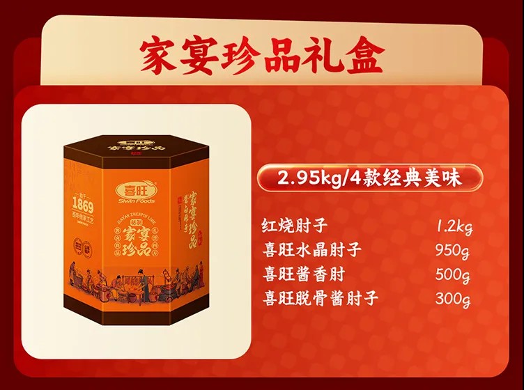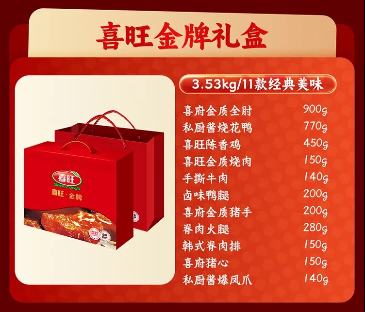 若是想集齐招牌风味,“喜旺金牌”礼盒便是首选,汇集多年热销爆款单品,一口解锁经典卤香,是老粉闭眼入的宝藏款;追求精致搭配可选“酱卤传奇”,四款高档酱卤制品精心组合,口感层次丰富,送礼更显用心;还有“禧满堂”“团圆礼”“福运来”等多款礼盒,性价比拉满,无论是走亲访友送长辈,还是邻里互赠传心意,都体面又实在。