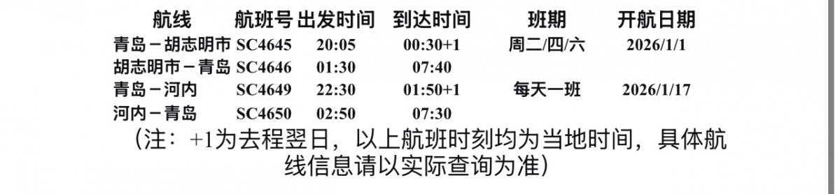 2026年1月起青岛可直飞越南双城 山航同步推出开航早鸟特惠