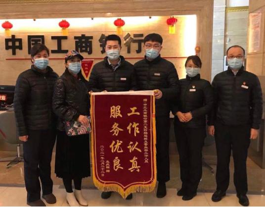 “感谢工商银行的杨经理在企业最困难的时候为我们提供了帮助和支持”!青岛某公司负责人将印有“尽职尽责服务到家 全心全意客户至上”的锦旗交到杨冠群手上。