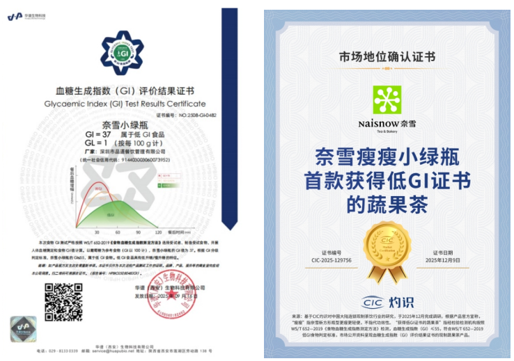 近日,作为茶饮行业首个采用“完美代糖”D -阿洛酮糖的创新产品,奈雪的茶“瘦瘦小绿瓶”成功拿下低GI认证(GI值仅37),同时获得全球咨询机构CIC灼识权威认证,被正式授予“行业首款获低GI证书的蔬果茶”市场地位。从使用0卡糖、2022年首创使用天然罗汉果糖,2024年成为首批营养分级试点企业、发起“不加糖·鲜果茶”倡议,再到2025年,奈雪联合农业农村部食物与营养发展研究所、新华网及百位专业营养师共同发起鲜果茶“天然营养+”计划,奈雪始终不懈的探索自然与健康。围绕“健康”关键词,奈雪逐渐沉淀出“健康公式”——超级食材+新鲜现制+低卡控糖。