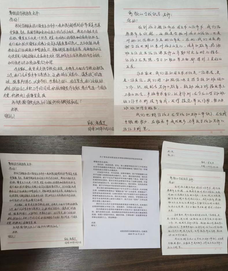为深入推进家校协同育人,搭建学校与家庭之间常态化、情感化、制度化的沟通桥梁,近日,青岛求实职业技术学院动物科技学院开展“任命书+获奖证书+家长回信”联动育人活动。通过向学生颁发岗位任命书、向家长寄送获奖证书与育人反馈,引导家长以回信形式参与学生成长评价与价值引领,形成“学校引导、家庭支持、学生主动”的共育合力,取得良好育人成效。