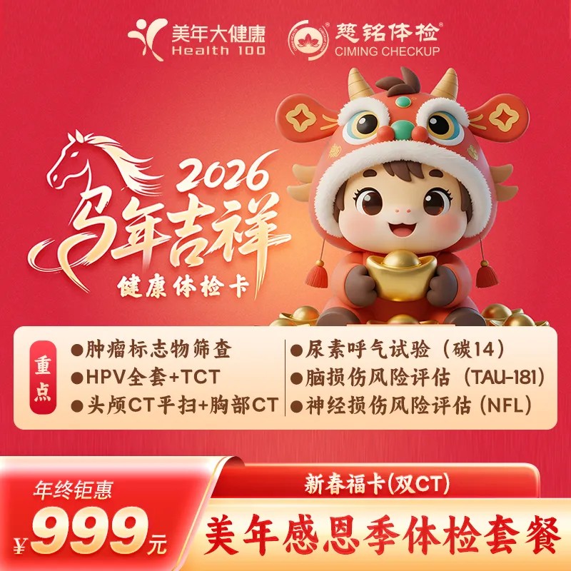 核心项目:脑损伤风险评估(TAU-181)、头颅CT+胸部CT、HPV全套+宫颈TCT检查、动脉硬化检测、尿素呼气试验(C13)、肿瘤标志物检测等。