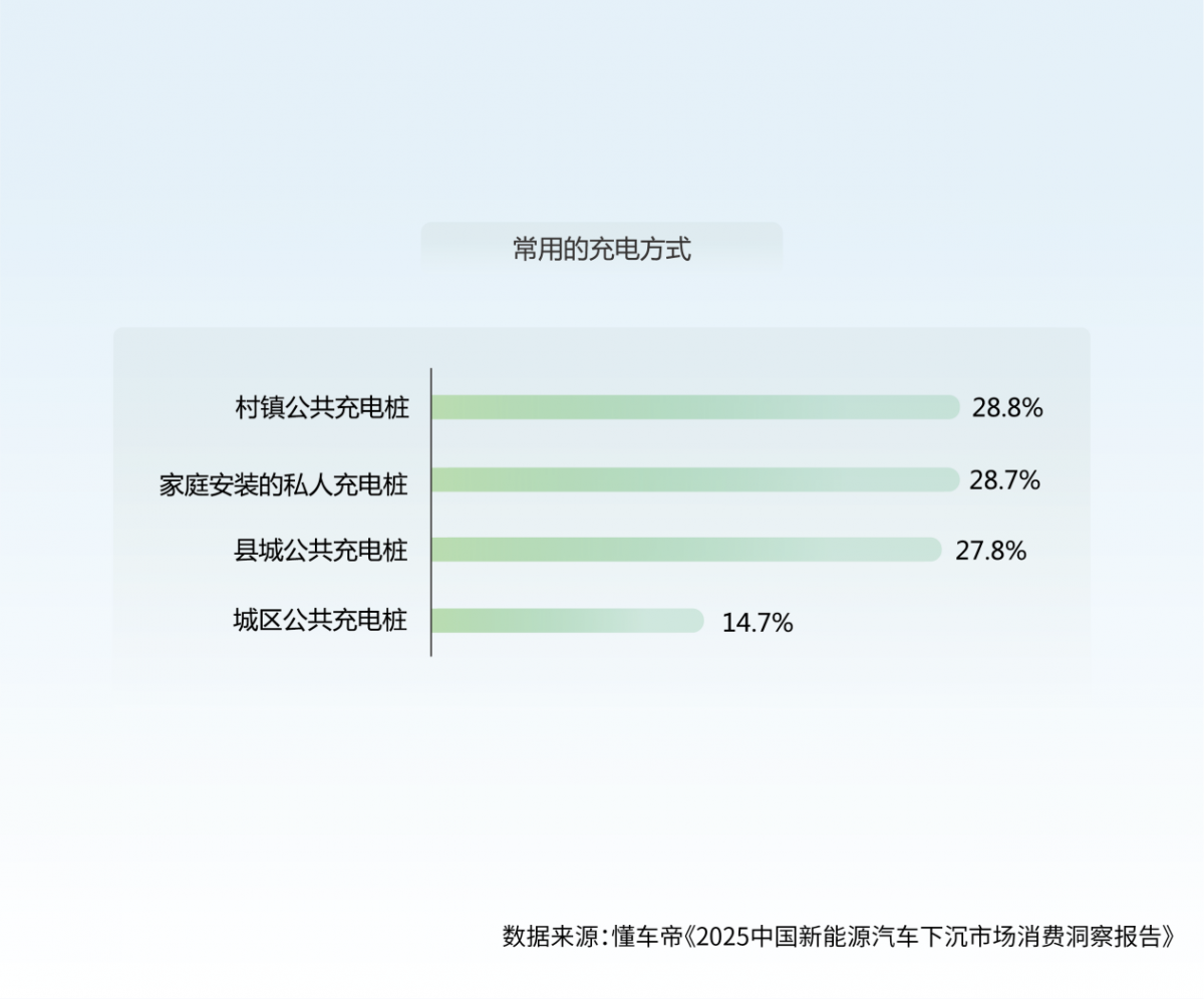 与维保情况类似,下沉市场充换电基础设施建设也相对不足。下沉市场用户中,使用公共充电桩充电的比例高达71.3%,有14.3%的用户日常要到远距离的城区公共充电桩充电;家庭私人充电桩拥有率仅28.7%。虽然近年来充电桩数量持续快速增长,但离“够用”仍有差距。