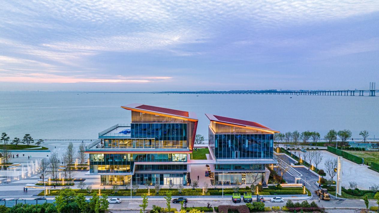 在空间维度,艺术中心与项目的湾海景观形成“自然与人文”的呼应。艺术中心采用大面积玻璃幕墙设计,将室外约1.47公里滨海景观线引入室内,观众在欣赏书画作品时,可透过落地窗望见碧海蓝天,实现“观画赏海”的沉浸式体验,成为欢乐滨海城板块的“艺术美学地标”。