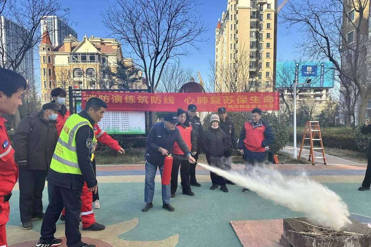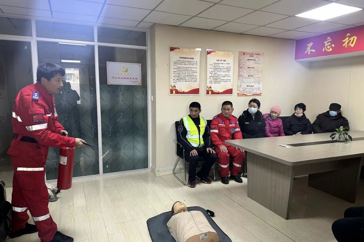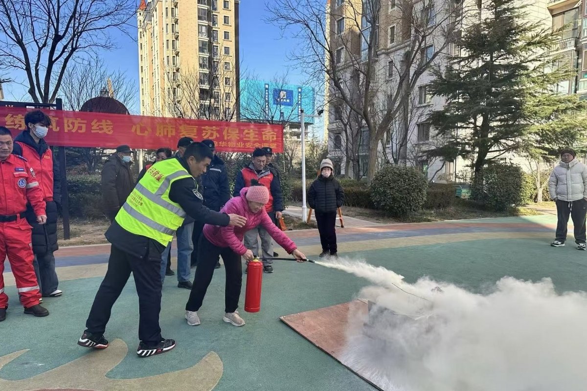 青岛斑马应急救援队副队长秦永乐、市北中队长郭强带队为社区物业工作人员和群众演示了消防器材使用。此次活动全程以“理论讲解+现场实操”相结合的方式推进,从消防疏散路线规划到急救技能细节把控,覆盖了社区生活中的关键安全场景。