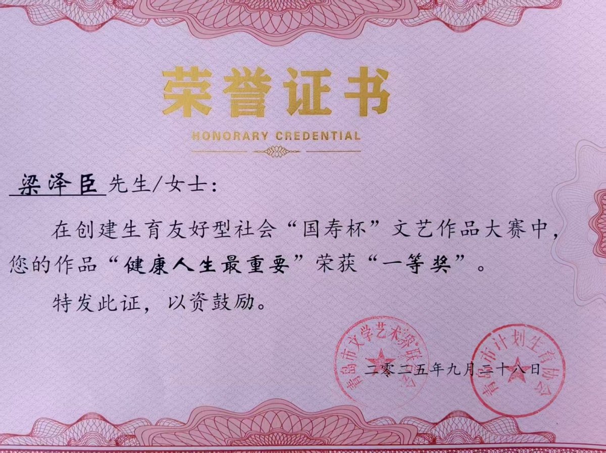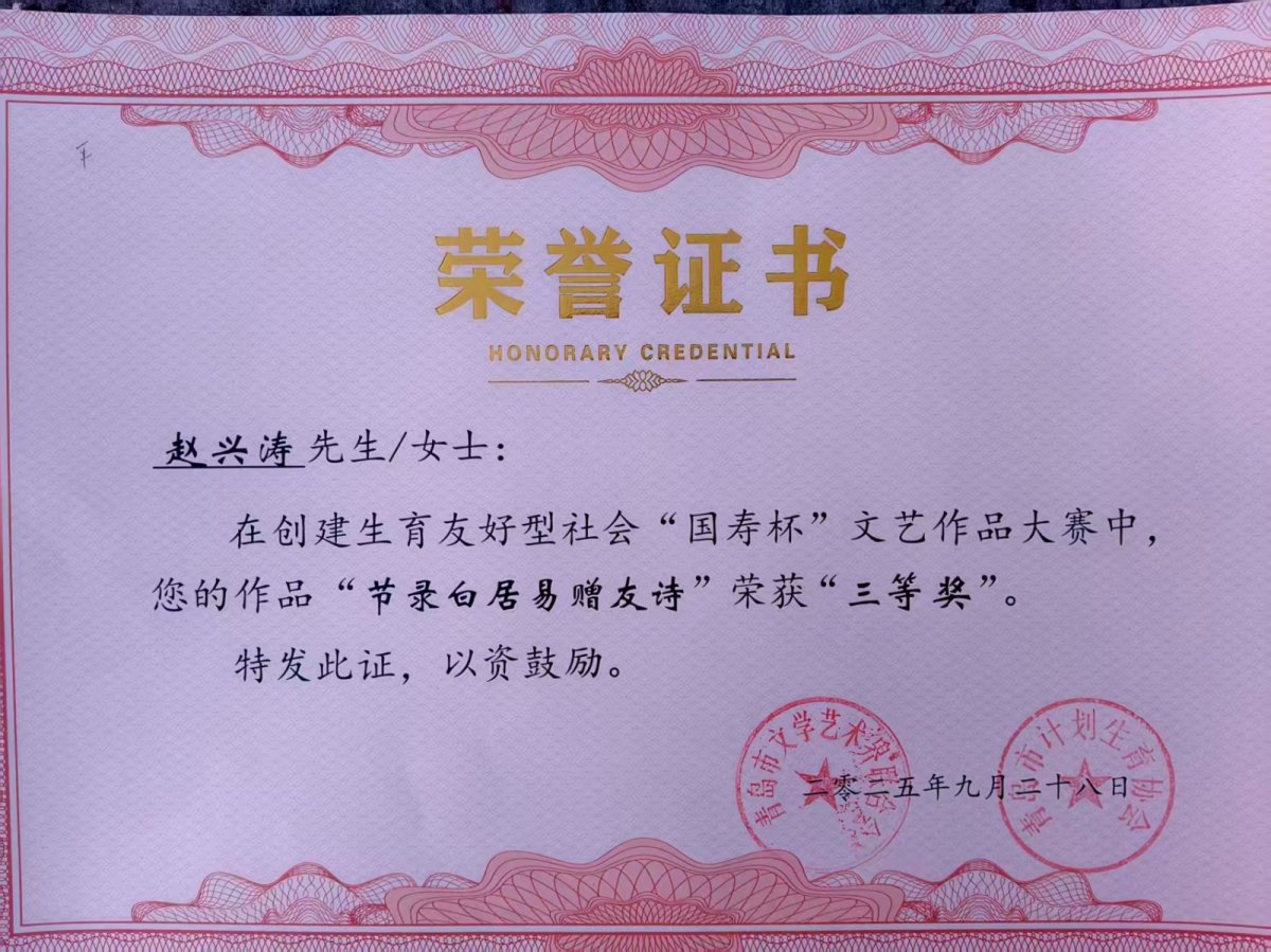 近日,由青岛市文联、青岛市卫计委携手举办的创建生育友好型社会“国寿杯”文艺作品大赛圆满落下帷幕,本次大赛设置书法、绘画、摄影等作品进行比赛,其中平度市人民医院医保结算科梁泽臣和康复理疗科赵兴涛在书画作品中脱颖而出,分别荣获一等奖和三等奖。