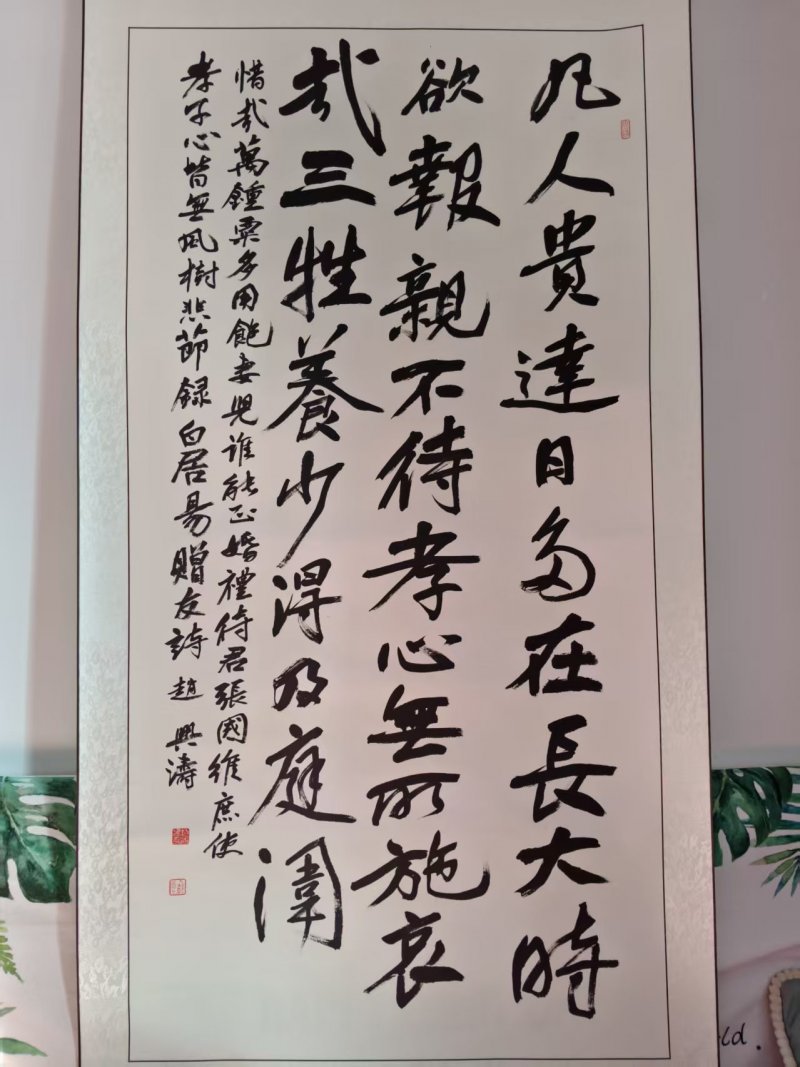 此获奖作品,书写的是白居易赠友诗。书法取法二王,兼有宋人意趣,提按分明,线条流畅富有弹性。结体舒展,字形大小错落有致,疏密得当。墨色浓淡干湿变化丰富,增强了作品的层次感和韵律美。章法采用竖式布局,气脉贯通,落款与印章位置恰当,与正文相得益彰,整体呈现出典雅灵动的艺术风格,展现出作者深厚的书法功底。