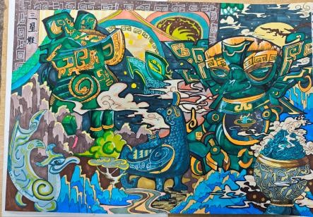 课程引入AI图像分析手段,通过观看《非遗里的中国》节目,引导学生对非遗元素进行解构。例如,在“传统剪纸数字化再生”绘制中,学生提取不同的剪纸造型,通过生成式AI模拟不同剪纸形式,观察传统剪纸艺术在当代视觉语境下的多种组合的可能性。“AI不是替代创作,而是拓展我们的审美数据库。”艺术设计专业学生分享道,他在设计《非遗青年造物集》中“三星堆”时,先用AI生成数十种三星堆样式草图,再从中选择最具神韵的三种进行手绘深化,使古老纹样既保留原始韵味,又贴合现代审美。