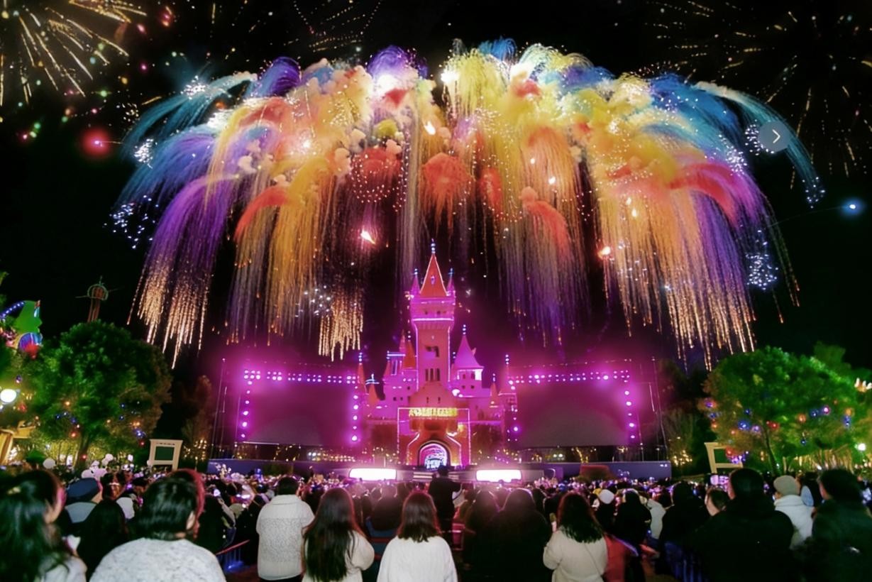 烟火寄情,共贺新岁。活动期间,全新升级的“福满新春烟花秀”每晚震撼上演,为本次“喜乐潮玩年”增添浪漫与仪式感,用璀璨光影照亮新春夜空,见证每一份团圆与美好。当烟花绽放的瞬间,现场欢呼声此起彼伏,游客们可与家人、朋友携手并肩,仰望漫天烟火,许下新春美好心愿。