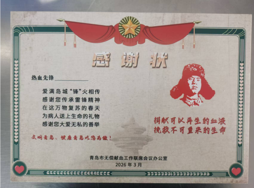 在学雷锋日到来之际,3月4日至5日,青岛市公共卫生临床中心分别在市北和高新两个院区组织医务人员开展无偿献血活动。广大职工积极响应,用热血传承雷锋精神,以实际行动诠释医者仁心。据统计,两院区共有63人成功献血,为保障临床用血贡献力量。