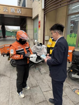 志愿服务队创新打造“阵地共建、资源共融、服务共享”宣传模式,联合新就业服务站点及银行网点构建“1+N”宣传网络——在银行网点、服务驿站、物流集散中心等重点区域,通过定制化设计“移动式宣传包”,设立“金融安全角”,实现宣传阵地精准覆盖;在物流园区、外卖配送站点等核心场景,宣传队伍深入开展“金融知识进站点”专项行动,围绕《存款保险条例》核心要义,通过“三问三答”(保什么、保多少、怎么赔)互动讲解模式,将存款保险知识融入骑手休息、快递派送等日常场景,实现宣传内容与工作场景的有机融合。