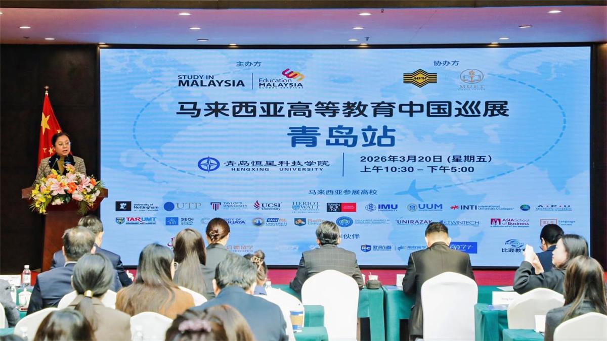 3月20日,由马来西亚教育全球服务中心(EMGS)主办,马来西亚考试理事会(MPM)、马来西亚大学教育联盟中国办公室(MUET)协办,青岛恒星科技学院承办的“2026马来西亚高等教育中国巡展青岛站”在恒星大酒店隆重开幕。这是本次马来西亚高等教育中国巡展的首站活动,马来西亚EMGS多位核心高管、22所马来西亚优质高校的校领导及代表齐聚青岛,共话中马高等教育合作与人才培养,为两地教育双向交流搭建起高效对接的桥梁。