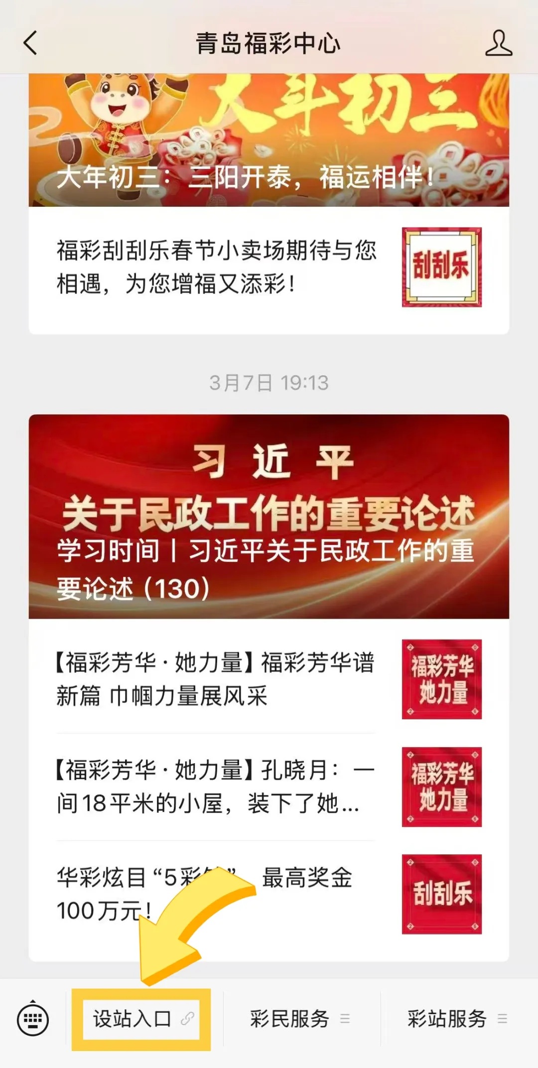 点击公众号下方菜单栏“设站入口”进入“福彩网办系统”页面;