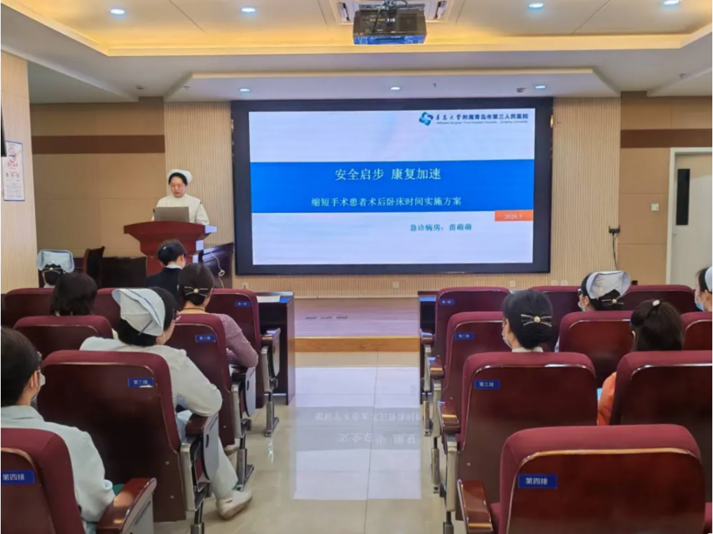 近日,青岛市第三人民医院护理部牵头、骨科张永春护士长组织召开“缩短手术患者术后卧床时间”实施方案专题培训会,大外科全体护士长及骨干参会,推动加速康复外科(ERAS)理念落地。