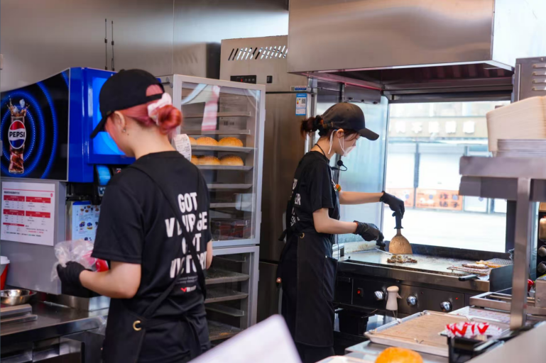 门店延续品牌“明厨亮灶”设计,从食材处理到汉堡成型的全过程清晰可见,让消费者吃得安心。空间上设置独立用餐空间,兼顾单人私密感与双人轻社交需求,既是高效午餐阵地,也成为年轻人打卡的潮流新地标。