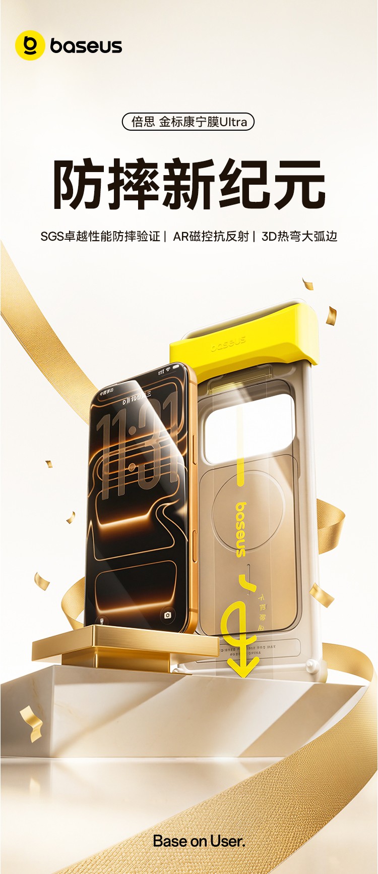 这背后的硬核支撑,源自倍思对底层工艺的深度打磨。材质层面,倍思金标康宁膜采用与iPhone同源的康宁GG3基材,从源头保障膜体的强韧度;结构方面,倍思自主研发“晶盾缓震”架构,大幅提升钢化膜的抗冲击与抗弯折性能,为手机屏幕提供360度无死角的安全守护。