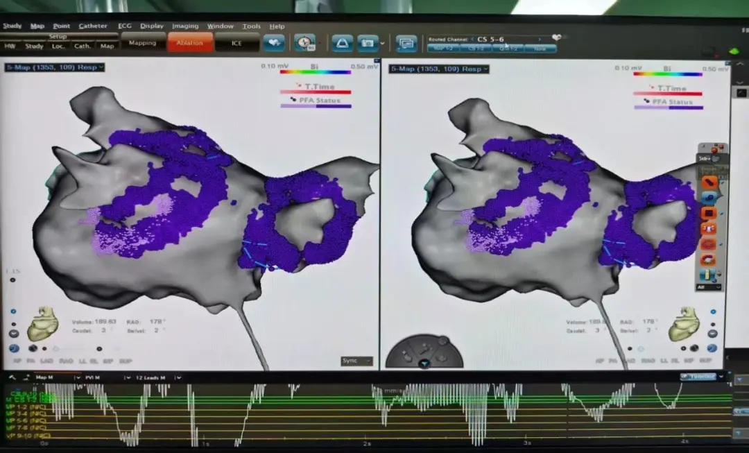 手术过程中,团队凭借精湛技艺与先进设备配合,仅通过微创方式,数十分钟即完成肺静脉隔离。与传统热消融相比,VARIPULSE系统利用超高速脉冲电场能量,选择性作用于心肌细胞,避免对周围血管、神经及食管的损伤风险。手术耗时短、安全性更高、患者恢复更快,术后患者心律即刻恢复窦性,症状显著改善。