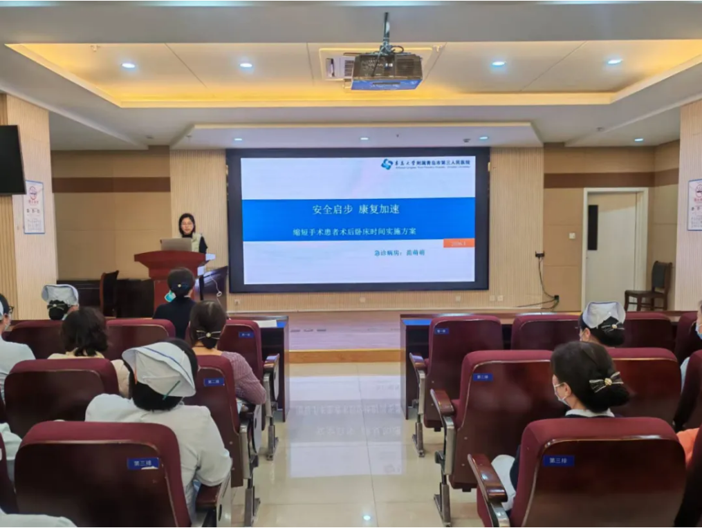 近日,青岛市第三人民医院护理部牵头、骨科张永春护士长组织召开“缩短手术患者术后卧床时间”实施方案专题培训会,大外科全体护士长及骨干参会,推动加速康复外科(ERAS)理念落地。