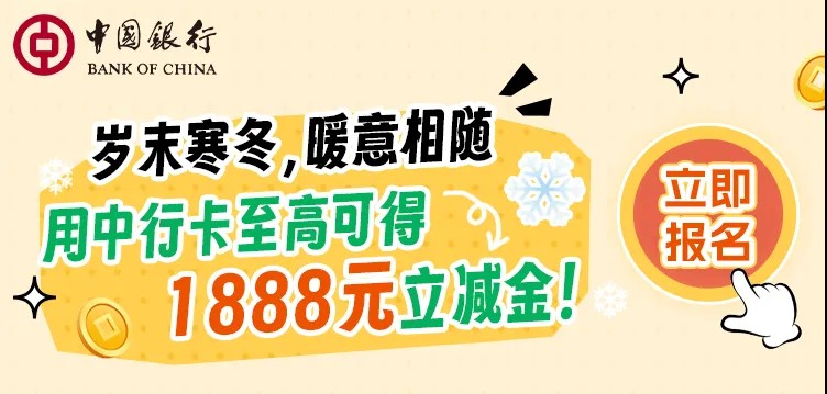 【支付超给“利”】岁末寒冬,暖意相随,用中行卡至高可得1888元立减金!