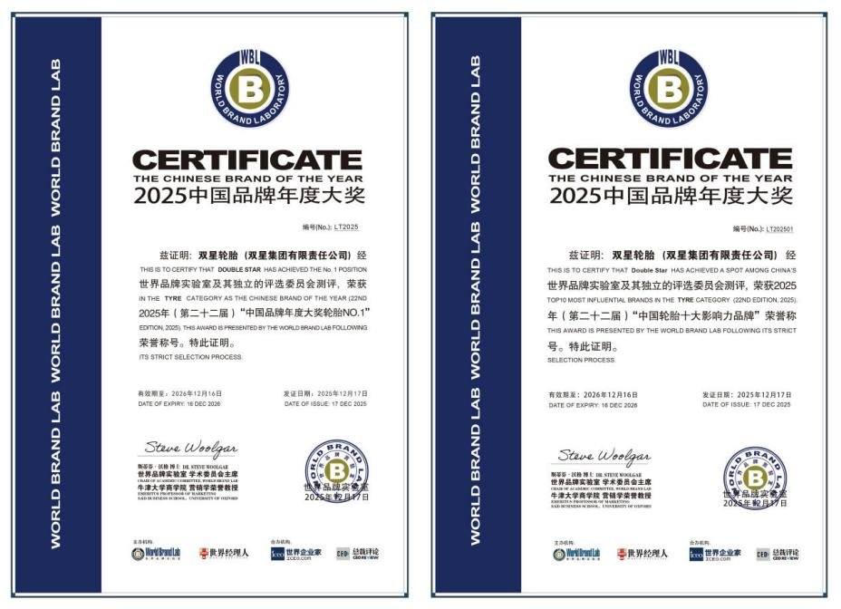 双星荣获“中国品牌年度大奖轮胎NO.1” 品牌影响力持续提升